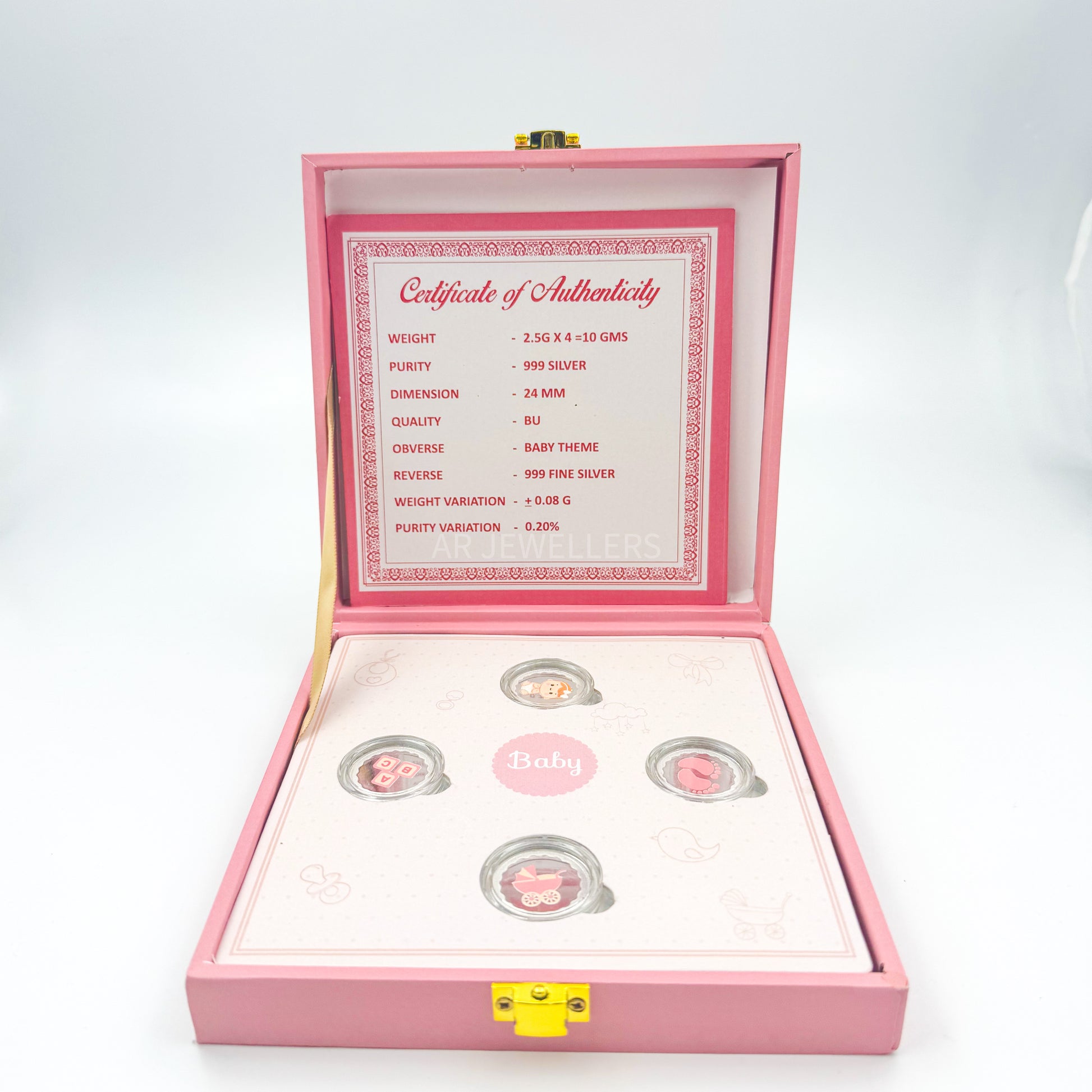 Celebrate the arrival of a newborn with this Pure Silver Baby Coin Set, featuring four beautifully crafted coins presented in an elegant gift box. Designed as a timeless keepsake, it makes an ideal gift for baby showers, whether for a boy or girl. Each coin symbolizes a precious moment, helping families cherish and preserve birth memories with a touch of expert craftsmanship and lasting value.